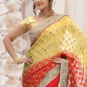 Enhance your beauty with this designer and charming red and yellow chiffon and net fabric party-wear saree.